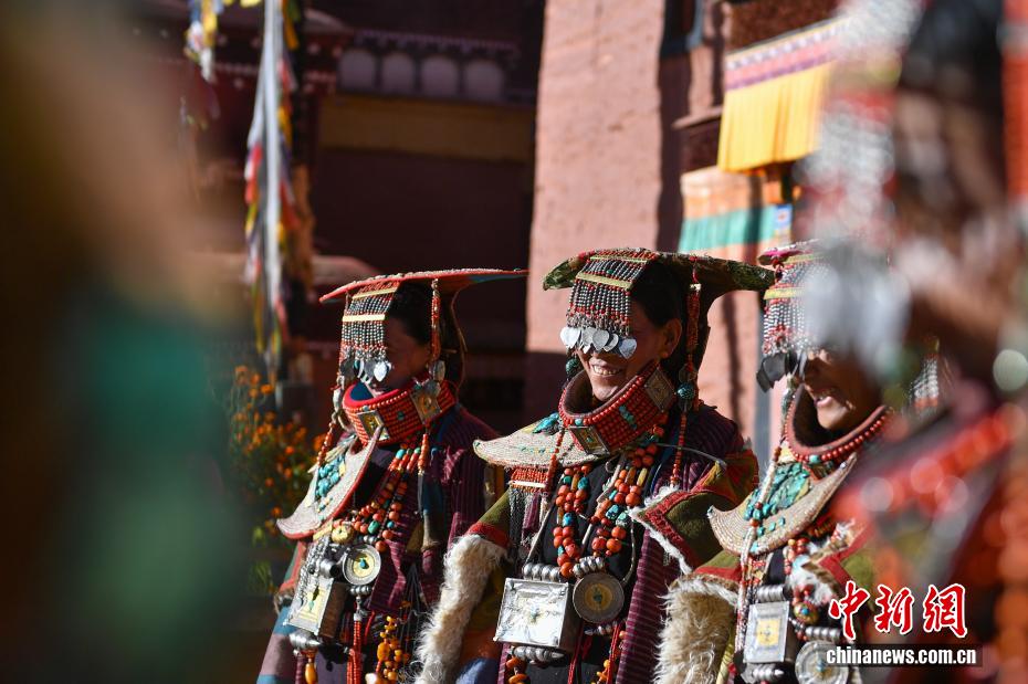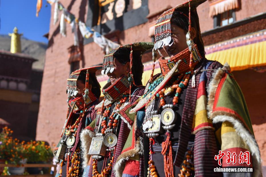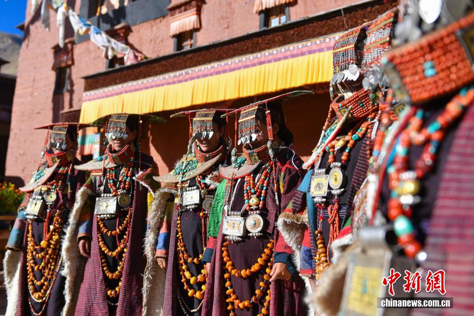 9月23日,西藏自治區(qū)阿里地區(qū)普蘭縣,至今保留著獨(dú)特的藏族服飾——普蘭服飾,它是中國國家級非物質(zhì)文化遺產(chǎn)。普蘭服飾已有1000多年的歷史,其中最精美、最獨(dú)特的是婦女的“孔雀服飾”,普蘭縣科迦村里有7戶人家保存著7套祖?zhèn)鞣?,一套重達(dá)20多公斤,裝飾有黃金、白銀、松石、瑪瑙、珊瑚、珍珠等,承載和沉淀了百年時光,堪稱“穿在身上的千年史”。時至今日,這種美麗的服飾文化還在當(dāng)?shù)貍鞒兄?。圖為西藏阿里地區(qū)普蘭縣科迦村,村民在展示普蘭服飾。貢確 攝