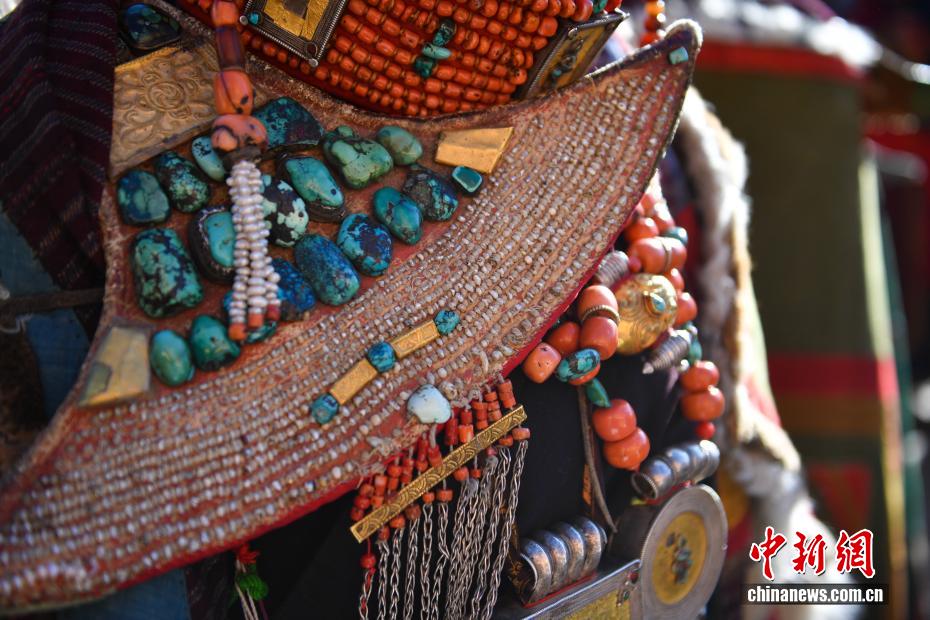 9月23日,西藏自治區(qū)阿里地區(qū)普蘭縣,至今保留著獨(dú)特的藏族服飾——普蘭服飾,它是中國國家級非物質(zhì)文化遺產(chǎn)。普蘭服飾已有1000多年的歷史,其中最精美、最獨(dú)特的是婦女的“孔雀服飾”,普蘭縣科迦村里有7戶人家保存著7套祖?zhèn)鞣棧惶字剡_(dá)20多公斤,裝飾有黃金、白銀、松石、瑪瑙、珊瑚、珍珠等,承載和沉淀了百年時光,堪稱“穿在身上的千年史”。時至今日,這種美麗的服飾文化還在當(dāng)?shù)貍鞒兄D為普蘭服飾細(xì)節(jié)展示。貢確 攝