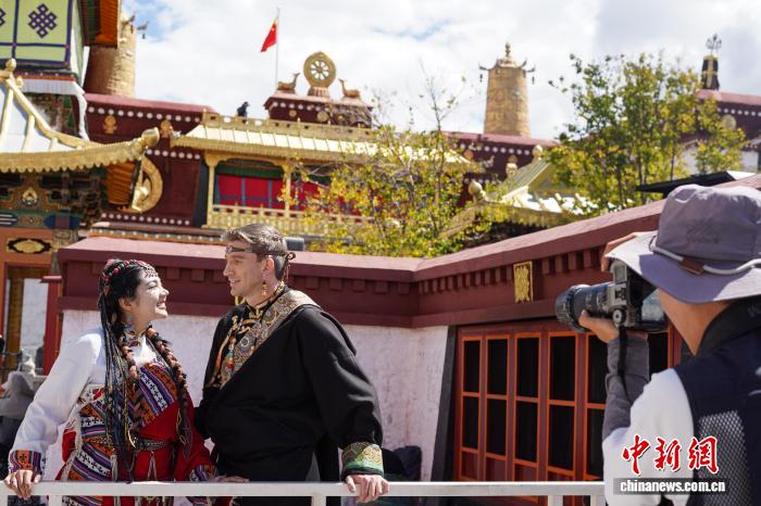 9月28日,西藏拉薩大昭寺、八廓街,來自意大利、烏克蘭、墨西哥等國的游客,身著色彩艷麗的藏族傳統(tǒng)服飾,在金頂紅墻的映襯下拍照留念。圖為來自意大利的游客身著藏裝在大昭寺廣場拍照留念。中新社記者 貢嘎來松 攝