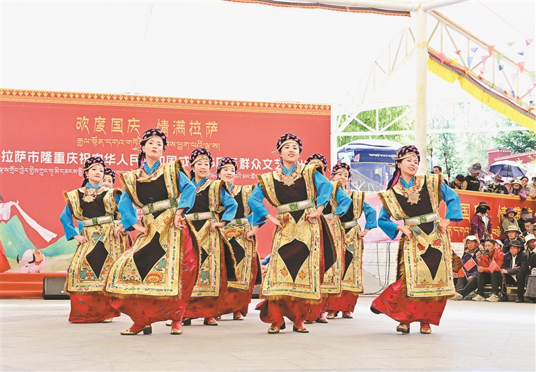 10月1日,宗角祿康公園內(nèi)歌舞飛揚、歡聲雷動,“歡度國慶·情滿拉薩”拉薩市隆重慶祝中華人民共和國成立76周年群眾文藝演出在這里舉行。演出現(xiàn)場氣氛熱烈,富有民族特色的藏戲、傳統(tǒng)歌舞接連上演,歌聲、掌聲、歡呼聲此起彼伏,生動表達(dá)了拉薩各族人民對偉大祖國的美好祝愿。圖為女子舞蹈《春韻》。記者 王敏 攝