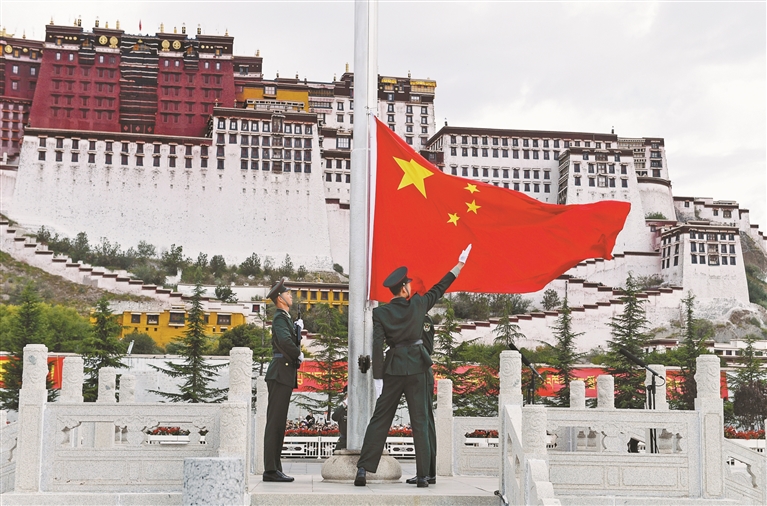 金秋十月舉國同慶,神州大地繁花似錦。10月1日上午,自治區(qū)慶祝中華人民共和國成立76周年“升國旗、唱國歌”儀式在布達(dá)拉宮廣場(chǎng)舉行。圖為儀式現(xiàn)場(chǎng)。記者 旦增蘭澤 攝