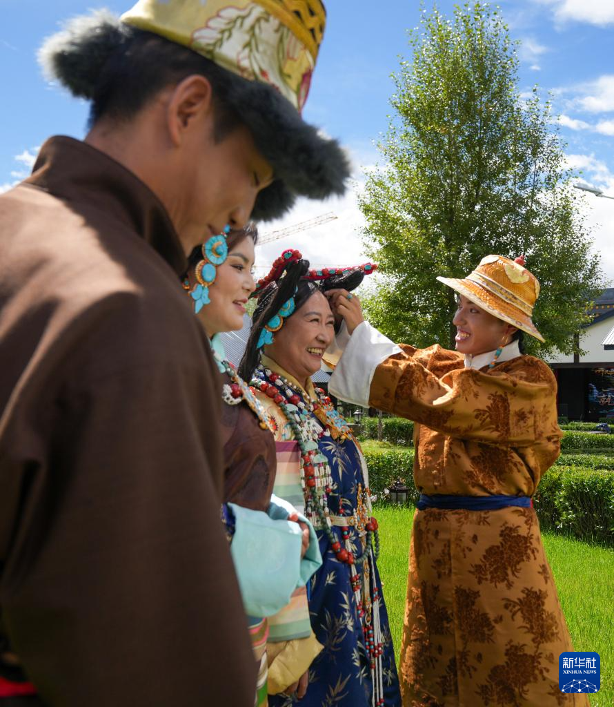 班珠丹塔為模特調(diào)整藏裝配飾(9月9日攝)。新華社記者 張笑宇 攝?