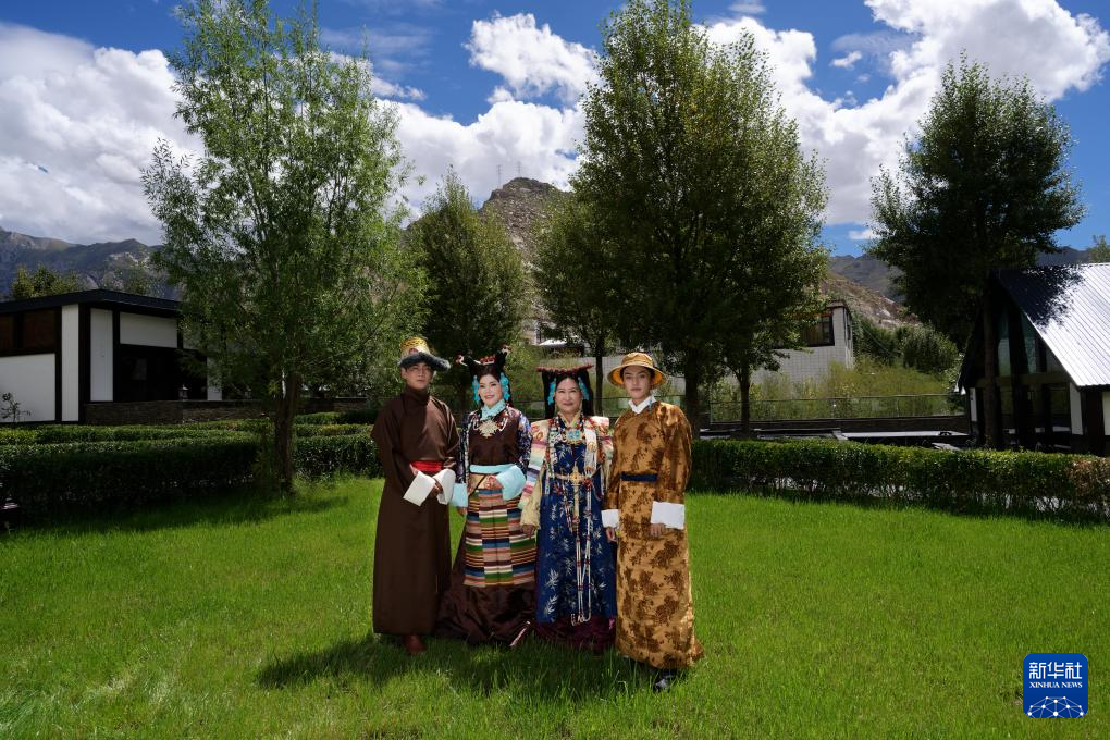 班珠丹塔(右一)和模特合影留念,模特們穿著由他設(shè)計(jì)的藏裝(9月9日攝)。新華社記者 張笑宇 攝??