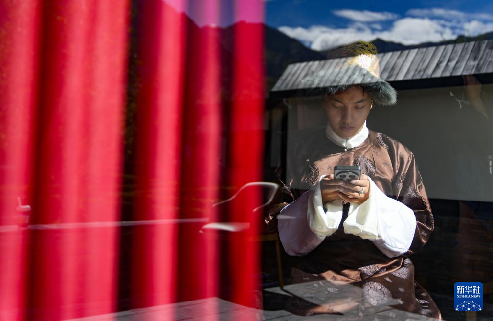 班珠丹塔在棚拍間隙處理工作事宜(9月9日攝)。新華社記者 晉美多吉 攝??