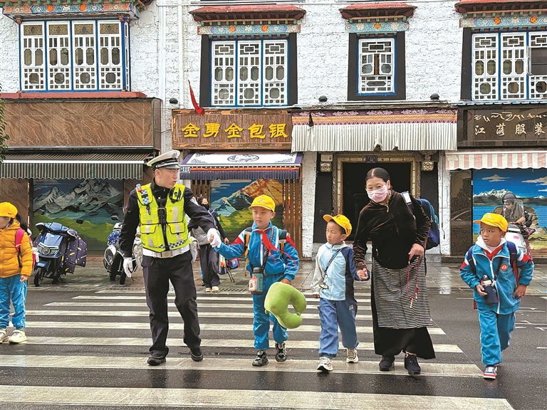 圖為拉薩市公安局交通管理支隊(duì)民警幫助獨(dú)行的學(xué)生穿過車流。記者 鹿麗娟 攝