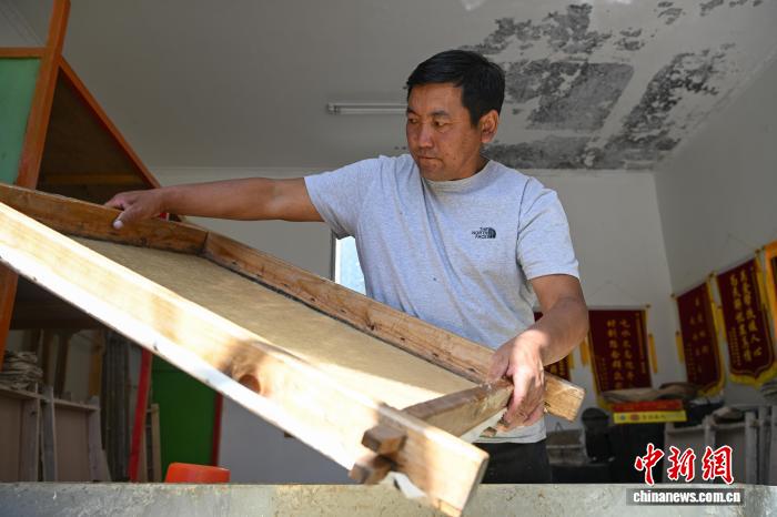 圖為尼木雪拉藏紙農(nóng)牧民專業(yè)合作社負(fù)責(zé)人格桑旦增在檢查藏紙的質(zhì)量。中新社記者 貢嘎來松 攝