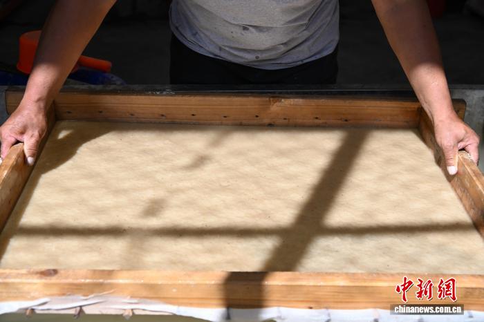 10月16日,“共建中華民族共同體書寫美麗西藏新篇章——魅力新拉薩 幸福高原城”暨中央媒體和網(wǎng)絡(luò)名人采風(fēng)活動(dòng)走進(jìn)西藏自治區(qū)拉薩市尼木縣尼木雪拉藏紙農(nóng)牧民專業(yè)合作社采訪中國國家級(jí)非物質(zhì)文化遺產(chǎn)代表性項(xiàng)目藏族造紙技藝。據(jù)悉,藏紙傳承至今已有1300多年歷史,雪拉藏紙作為西藏三大藏紙之一,其特殊原料配方造就“蟲不蛀、鼠不咬、不腐不變色”的特性,用它印制的文史經(jīng)典千余年完好如初。圖為尼木雪拉藏紙農(nóng)牧民專業(yè)合作社員工在制作藏紙。中新社記者 貢嘎來松 攝