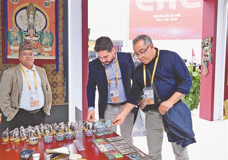 圖為第八屆中國國際進口博覽會西藏館內的客人在選購商品。記者 王敏 索朗瓊珠 嘎松卓瑪 攝影報道