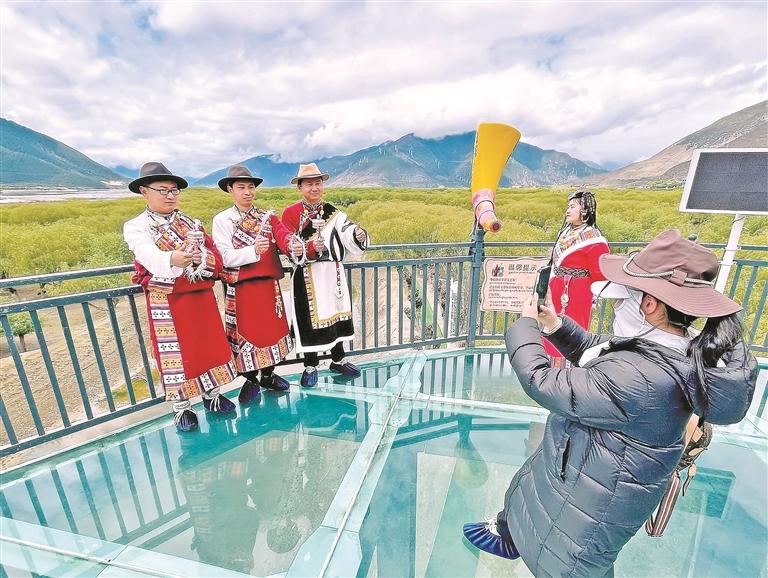 林芝尼洋河國家濕地公園旁,游客駐足合影,定格江河美景。 記者 次仁平措 攝