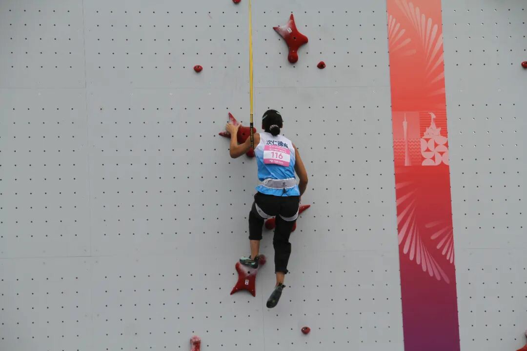 西藏隊(duì)次仁德吉在十五運(yùn)會(huì)攀巖項(xiàng)目女子速度攀巖預(yù)賽賽場(chǎng)上。