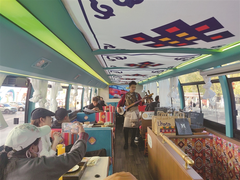游客筱康從成都專程來到拉薩,通過網(wǎng)絡(luò)平臺(tái)了解到這輛觀光巴士后,毫不猶豫地購(gòu)買車票前來體驗(yàn)。坐上巴士,窗外的風(fēng)景如同一幅流動(dòng)的畫卷,隨著車輪的前行緩緩展開。八廓商城的熱鬧繁華、布達(dá)拉宮的雄偉壯觀、拉薩河的寧?kù)o秀麗、遠(yuǎn)處落日的余暉灑在大地上,川流不息的人群穿梭其中,側(cè)耳傾聽是城市的低語(yǔ),煙火氣縈繞良久。而低頭品嘗著現(xiàn)做的美食,熱氣氤氳間,他深深感受到了這座城市的溫柔與魅力。筱康興奮地說:“我覺得這次體驗(yàn)感簡(jiǎn)直太棒了!觀光巴士沿著拉薩主城區(qū)的路線行駛,沿途可以看到大昭寺、布達(dá)拉宮、羅布林卡、拉薩河、南山公園等眾多美麗的風(fēng)景。更重要的是,車上還可以品嘗到現(xiàn)做的美食,喝著甜茶,欣賞著特色節(jié)目,還能親眼看到工作人員制作酥油茶、甜茶的過程,品嘗青稞爆米花,這種全新的體驗(yàn)真的非常值得推薦!”