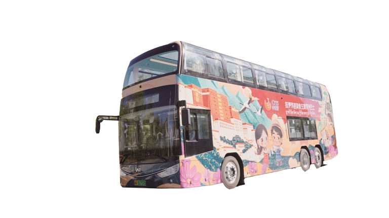拉薩雙層美食主題觀光巴士車身以中國(guó)紅為主色調(diào),點(diǎn)綴著黑頸鶴、拉薩兒童笑臉及布達(dá)拉宮等標(biāo)志性景觀圖案,每一處細(xì)節(jié)都散發(fā)著濃郁的地域文化氣息。