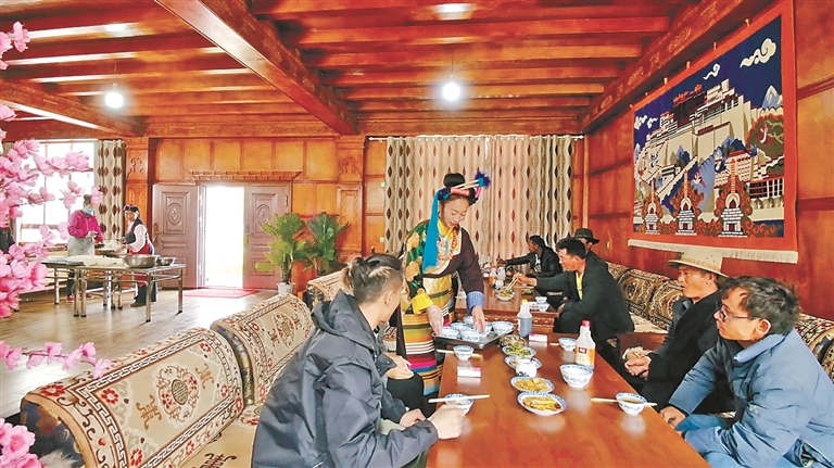 作為自治區(qū)級非遺傳承人、芒康縣“婦女致富帶頭人”的卓瑪拉姆,于2010年開辦鹽井果拉叢農(nóng)家樂,憑借著正宗的加加面風味和熱情的服務,逐漸積累了口碑。2012年,在各級政府的支持下,她采用“民族特色餐飲+鄉(xiāng)村旅游接待”的經(jīng)營模式,生意日益紅火。2017年,通過貸款300萬元、自籌160萬元翻建了農(nóng)家樂,將其升級為綜合型的民族特色餐飲店,經(jīng)營規(guī)模大幅擴大,最多時日接待游客達300余人。