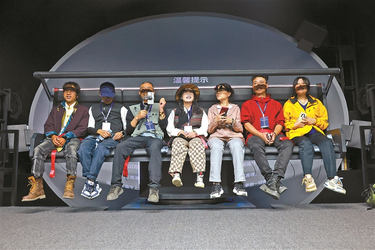 圖為游客在8D飛行影院體驗(yàn)并了解瓊結(jié)縣的歷史人文。