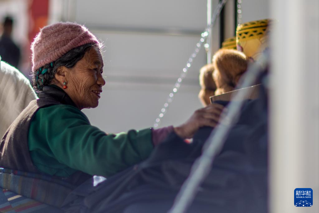 1月5日,在森嘎村村史館前的廣場(chǎng)上,老人曬著太陽(yáng)吃著零食。新華社記者 姜帆 攝