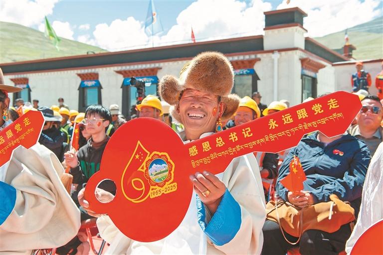 2025年8月15日,定日地震災(zāi)后恢復(fù)重建首批民房入住儀式現(xiàn)場,群眾代表拿到新居“鑰匙”。西藏日報記者 旦增嘎瓦 攝