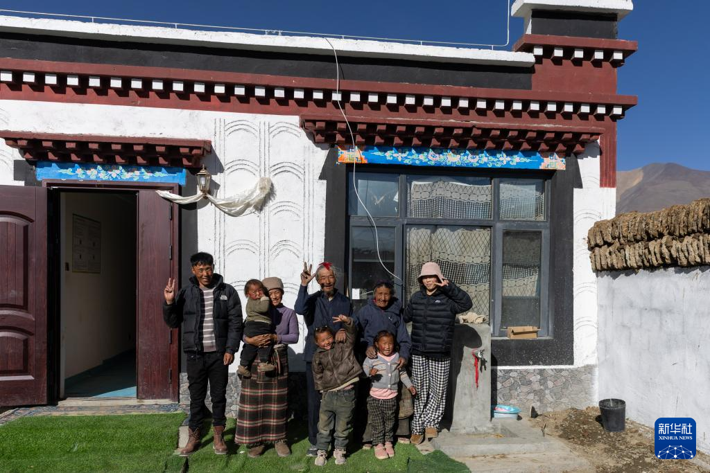 次仁拉姆(左二)和家人在新居前合影(2026年1月5日攝)。新華社記者 姜帆 攝