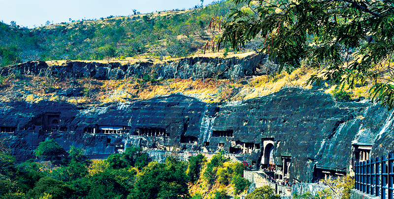 印度阿旃陀石窟鑿于一處馬蹄形暗色巖陡崖上,其形成年代主要分為兩個時期:公元前2世紀(jì)至公元前1世紀(jì)和公元5至6世紀(jì)。它集古代建筑、雕刻、繪畫之大成,融佛教信仰、文化變遷、社會生活于一體,既具有極高的藝術(shù)價值,又飽含深厚的歷史底蘊。圖為在印度馬哈拉施特拉邦拍攝的阿旃陀石窟外景。 新華社記者 張迺杰/攝