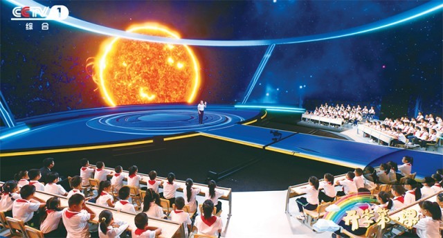 2023年《開(kāi)學(xué)第一課》以“強(qiáng)國(guó)復(fù)興有我”為主題,從傳統(tǒng)文化、文明探源、生態(tài)文明、鄉(xiāng)村振興、國(guó)防教育、科技創(chuàng)新等多個(gè)方面,全景展示中國(guó)式現(xiàn)代化的萬(wàn)千氣象。圖為中國(guó)科學(xué)院高能物理研究所研究員、“拉索”(LHAASO)首席科學(xué)家曹臻在向同學(xué)們介紹世界上海拔最高、規(guī)模最大的宇宙射線觀測(cè)裝置“拉索”的前世今生。 教育部供圖