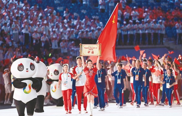 2023年7月28日,第31屆世界大學(xué)生夏季運(yùn)動(dòng)會(huì)開(kāi)幕式在成都東安湖體育公園主體育場(chǎng)舉行。圖為中國(guó)大學(xué)生體育代表團(tuán)在開(kāi)幕式上入場(chǎng)。 新華社記者 王曦/攝