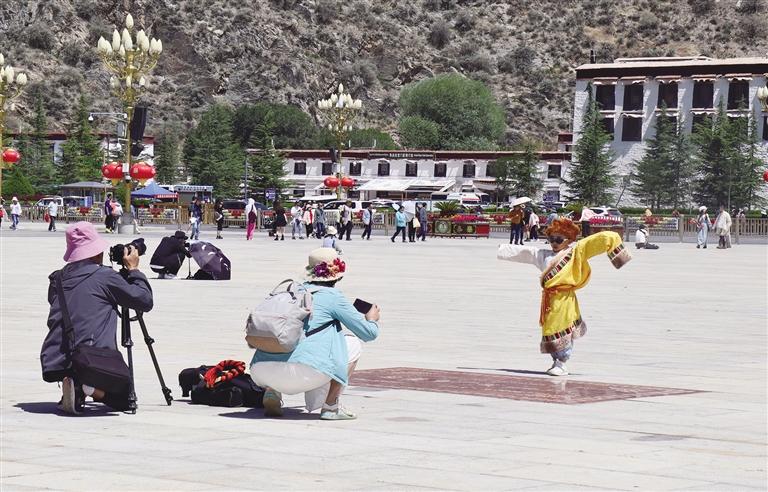 布達(dá)拉宮廣場上身著藏裝拍游客照的小朋友。記者 張琳