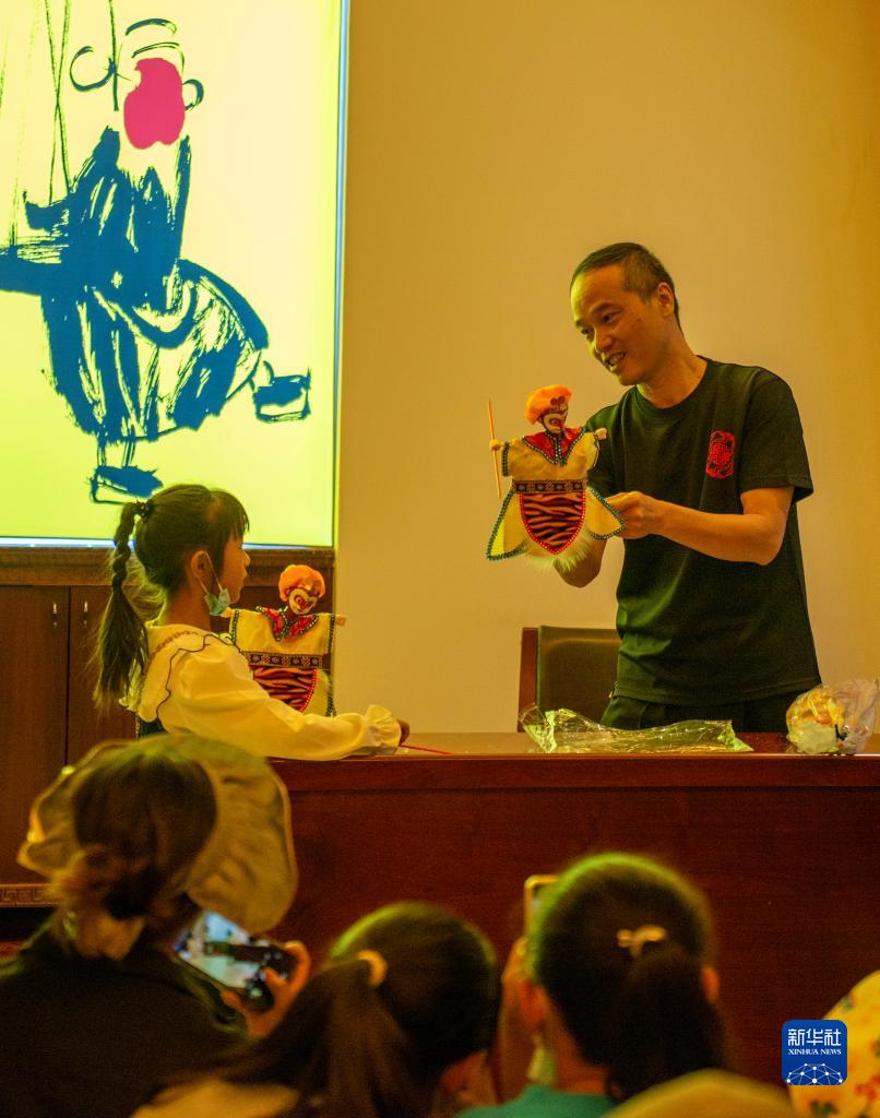 7月29日,泉州市提線木偶戲傳承保護(hù)中心國(guó)家一級(jí)演員沈蘇革(右)在展覽上為拉薩小學(xué)生講解木偶戲。新華社記者 劉洲鵬 攝