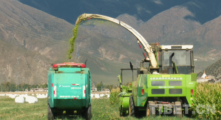 在達孜金麥穗合作社的青飼玉米地里,大型收割機、包裝機、拖拉機等“各盡其職”,田間地頭一派繁忙的景象。