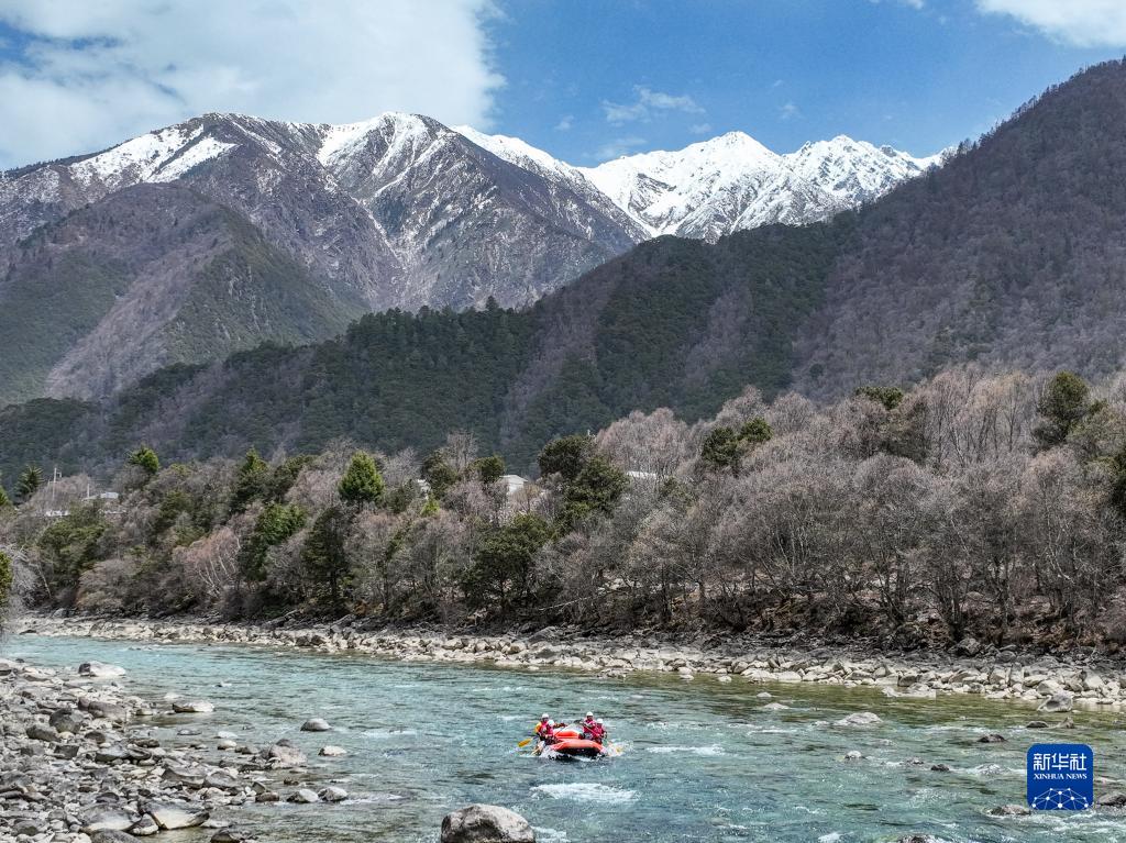4月16日,“西藏旅游股份有限公司漂流隊”選手在激流漂流筏繞標(biāo)賽中,他們最終獲得季軍(無人機照片)。新華社記者 孫非 攝