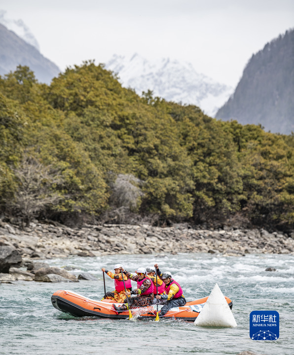 4月16日,在激流漂流筏繞標(biāo)賽中,“星野新域漂流隊”選手向終點沖擊。他們最終獲得第十名。新華社記者 孫非 攝