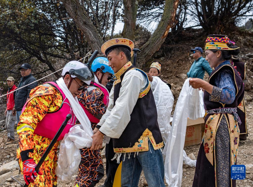 4月16日,激流漂流筏繞標(biāo)賽后,當(dāng)?shù)厝罕娊o完賽運動員獻(xiàn)上哈達(dá)。新華社記者 孫非 攝