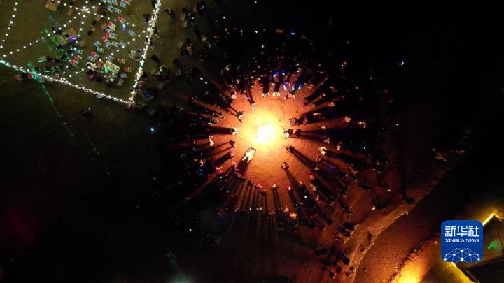 4月27日,游客們?cè)凇斑^林卡”現(xiàn)場(chǎng)跳起鍋莊舞,氣氛熱烈(無人機(jī)照片)。新華社記者聶毅 攝
