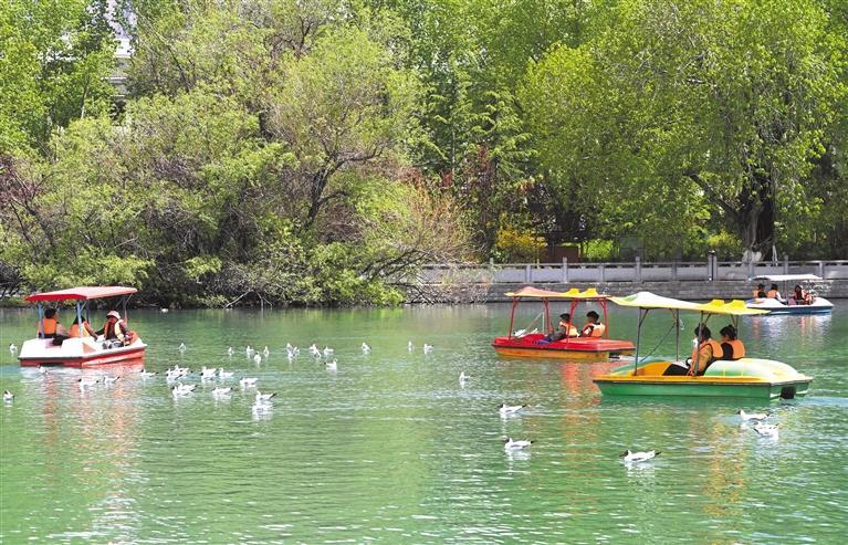 立夏時(shí)節(jié),拉薩處處綠樹成蔭、鳥語花香。宗角祿康公園樹木郁郁蔥蔥、湖水清澈見底,成為市民和游客游玩、休閑的好去處。 圖為市民和游客在宗角祿康公園乘船游玩。記者 洛桑 攝