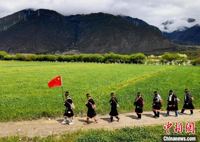 圖為村民背上經(jīng)文繞田?!∏?攝