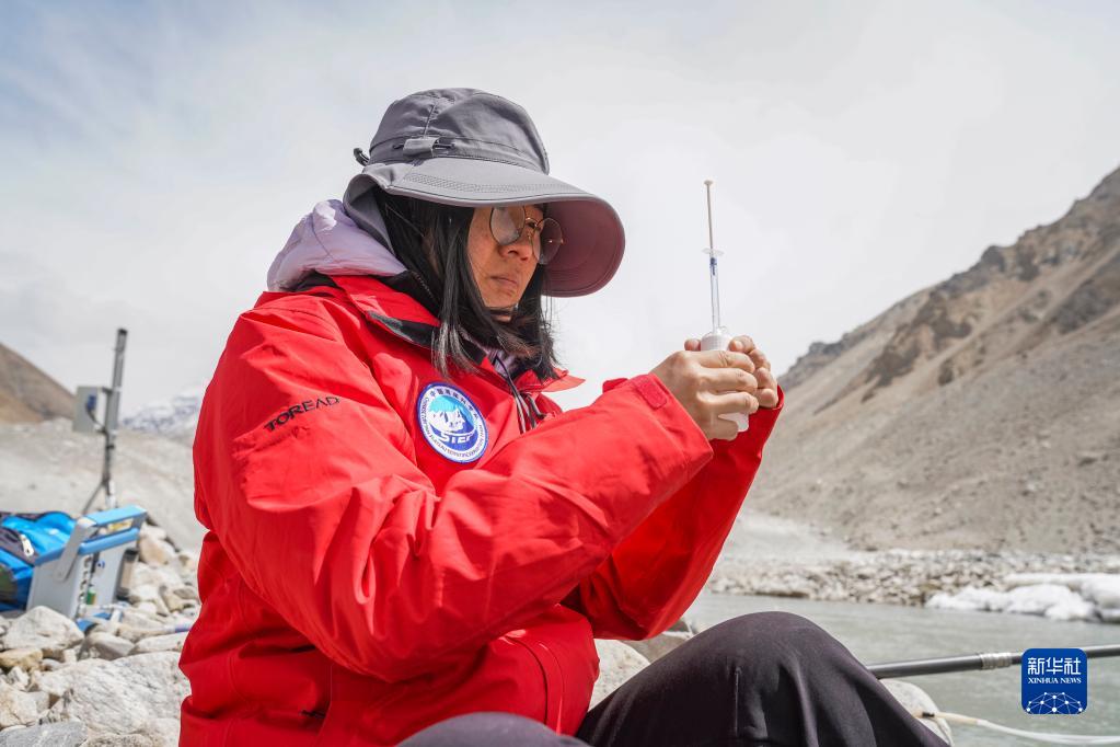 在珠峰登山大本營附近,來自中國科學(xué)院青藏高原研究所的科考隊(duì)員邱海英在檢測絨布冰川末端水質(zhì)(5月14日攝)。新華社記者 孫非 攝
