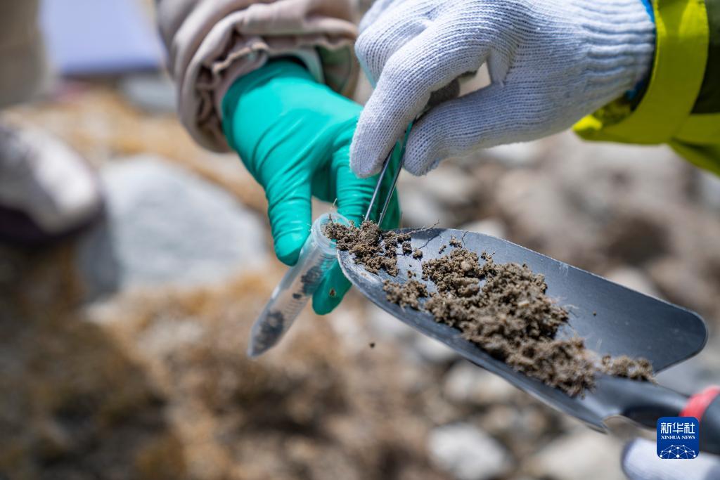在珠峰登山大本營附近,來自西藏大學(xué)生態(tài)環(huán)境學(xué)院的科考隊(duì)員在收集土壤樣本(5月22日攝)。新華社記者 孫非 攝