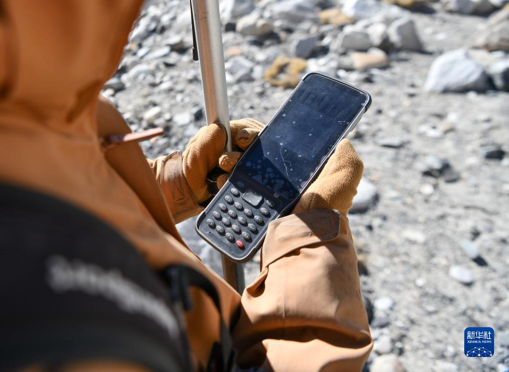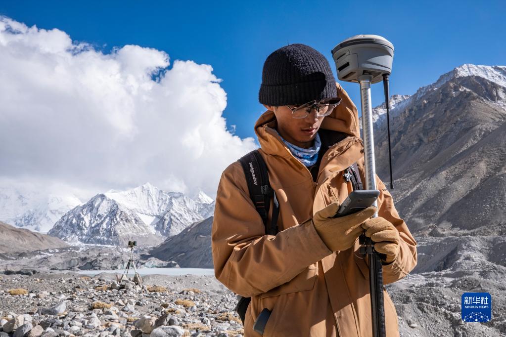 在珠峰海拔約5300米處,來自中國科學(xué)院西北生態(tài)環(huán)境資源研究院的科考隊(duì)員薛雨昂在對(duì)冰川進(jìn)行實(shí)時(shí)差分GPS定位(5月15日攝)。新華社記者 晉美多吉 攝