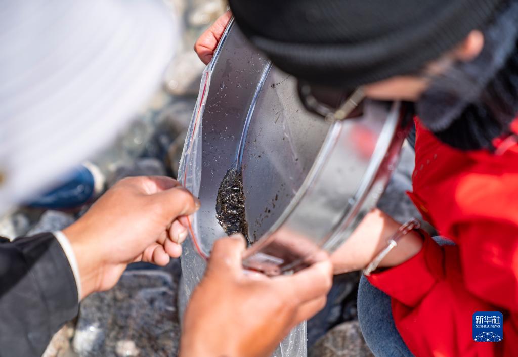在珠峰登山大本營附近,來自西藏大學(xué)生態(tài)環(huán)境學(xué)院的科考隊(duì)員在收集水生生物樣本(5月22日攝)。新華社記者 孫非 攝