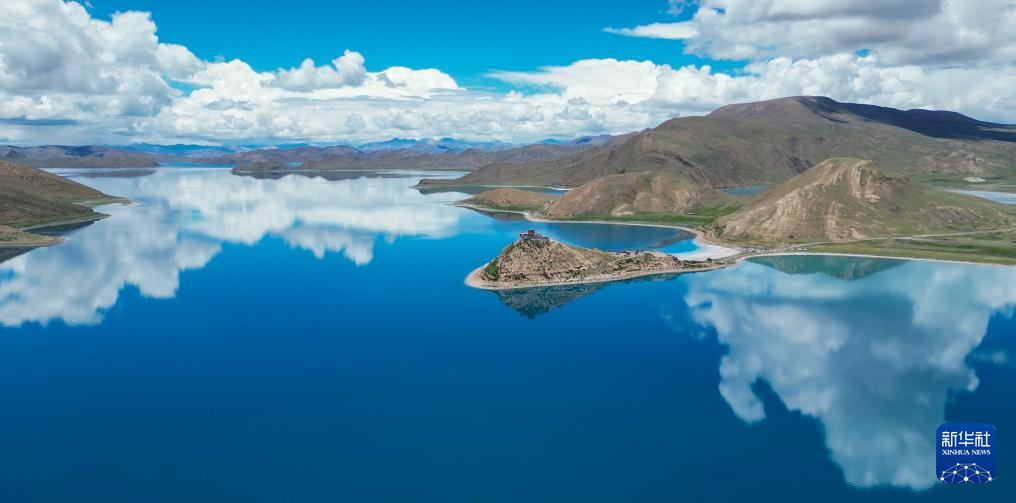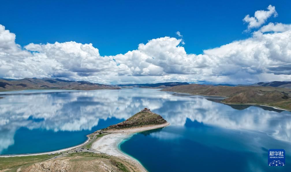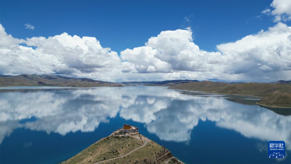 坐落于羊湖北岸一座半島上的日托寺(無人機(jī)照片,7月22日攝)新華社記者 聶毅 攝