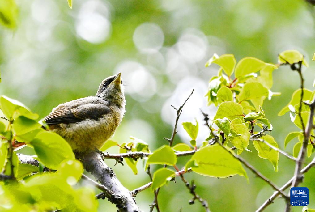 在拉薩市城關(guān)區(qū)一處庭院的樹枝上,一只伯勞幼鳥在四處觀望(7月28日攝)。新華社記者 張汝鋒 攝