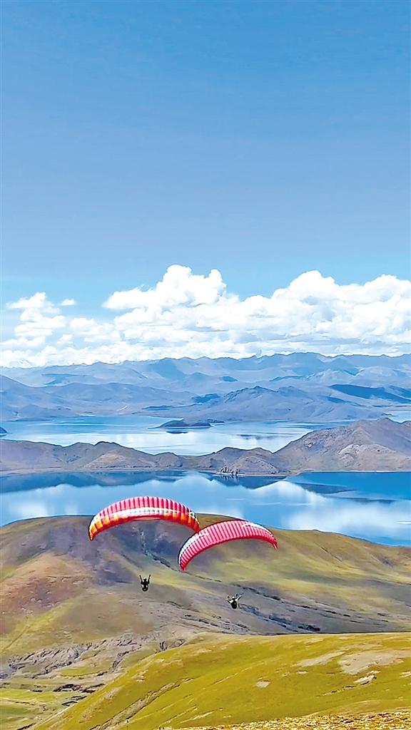5月,午后的羊卓雍錯(以下簡稱羊湖)別具魅力。在海拔大約5000米的山頂上,經(jīng)過一番準備,來自深圳的游客朱先生跟隨教練口令向懸崖邊沖去?;鑲惚粴饬魍信e著騰空而起,劃出一道優(yōu)美的弧線,像雄鷹一樣翱翔在波光粼粼的湖面上,最后飄然降落在湖邊……