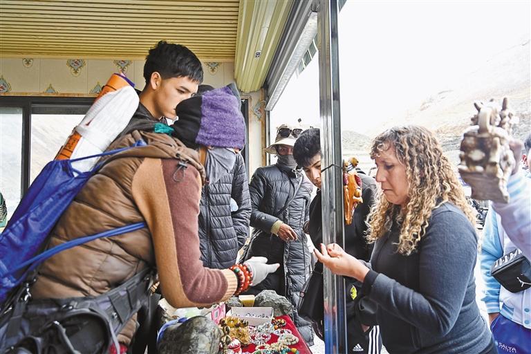 新奇感過后,游客們開啟購物模式。“阿佳,這個掛飾可以定制嗎?”“你們可以發(fā)快遞嗎?”對于一連串的問題,阿佳格桑忙碌地一一回答著,“你們想要什么圖形,我們就給你定制什么圖形。”“我們這兒快遞很快,今天下單明天就給你發(fā)!”短短半個小時,“阿佳格桑工坊”的生意火爆,銷售藏式靠墊、藏式地毯、掛飾等特色產品4000多元。“回去后,我要通過自媒體平臺,宣傳這次西藏之旅的所見所聞,讓更多親朋好友來西藏旅游!”日本游客琴音有感而發(fā)。
