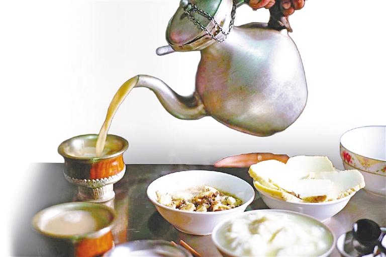 人們平常吃的早餐有粥、包子、豆?jié){、面條等,而在高原地區(qū),糌粑和酥油茶是當(dāng)?shù)厝说臓I養(yǎng)早餐,也是藏族人餐桌上的必選。其中,酥油茶是為適應(yīng)高寒環(huán)境而創(chuàng)造的特色飲品。它是將牦牛奶提煉的酥油與磚茶湯混合,加入鹽調(diào)味制成的,口感濃郁醇厚。其高脂肪、高熱量的特性,既能抵御嚴(yán)寒,又可緩解高原缺氧帶來的疲勞,既是當(dāng)?shù)厝说脑绮?,也是日常生活中的必需品?/p>
