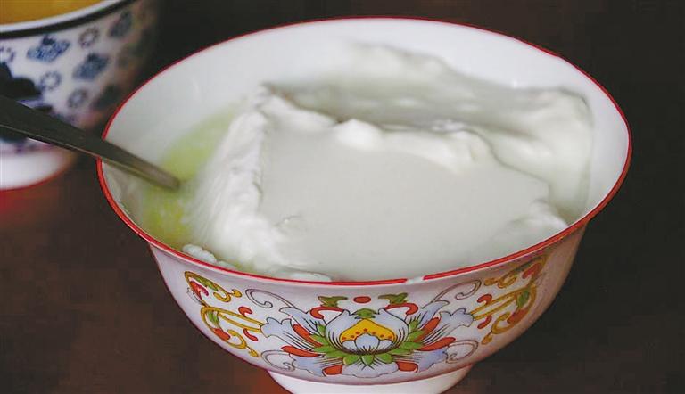 除了常規(guī)的高蛋白大餐,西藏還有許多特色美食,酸奶拌飯便是夏日爽口美食之一。酸奶帶著牦牛奶獨(dú)特的鮮味,提煉后形如“豆腐腦”,白嫩滑溜,口感微酸與微甜交織,令人身心愉悅。在藏族世代延續(xù)的飲食文化中,酸奶拌飯因其豐富的營養(yǎng)價(jià)值,深受人們喜愛。