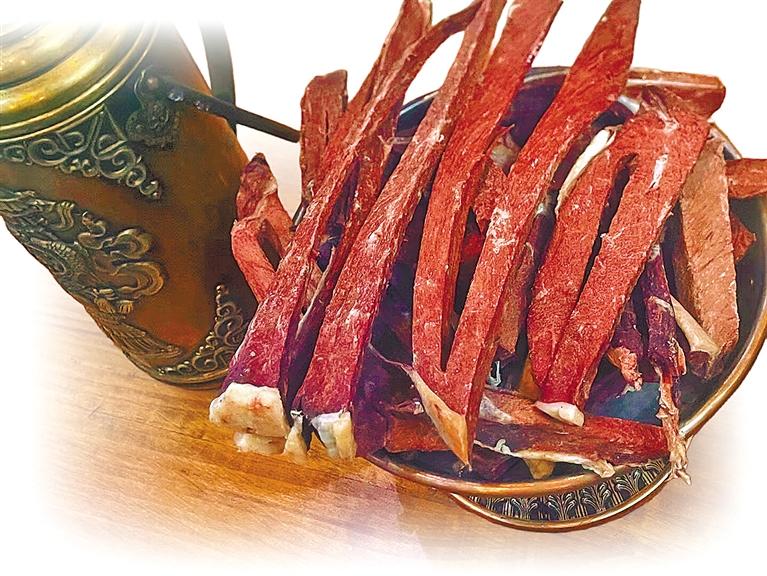 在高原,人們還熱衷于原汁原味的零食,風(fēng)干牦牛肉是藏族人民的冬季寶藏零食。風(fēng)干牛肉必須在嚴(yán)寒的冬季制作才能保留其原汁原味,牦牛的后腿或里脊肉最適合做風(fēng)干牛肉。把肉切成粗條,用鹽巴或花椒、辣椒等香料揉搓,懸掛在陰涼的通風(fēng)處,高原的嚴(yán)寒和干燥的空氣促使牛肉自然風(fēng)干。這樣做出的肉干嚼勁十足,是真正的高原蛋白質(zhì),也是藏族人待客的首選美味。