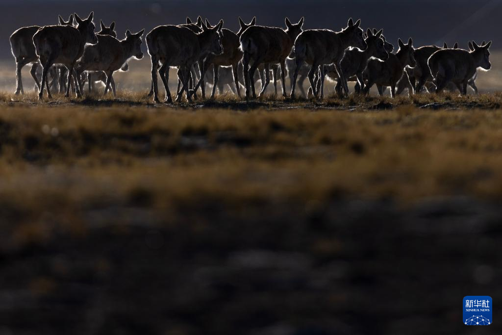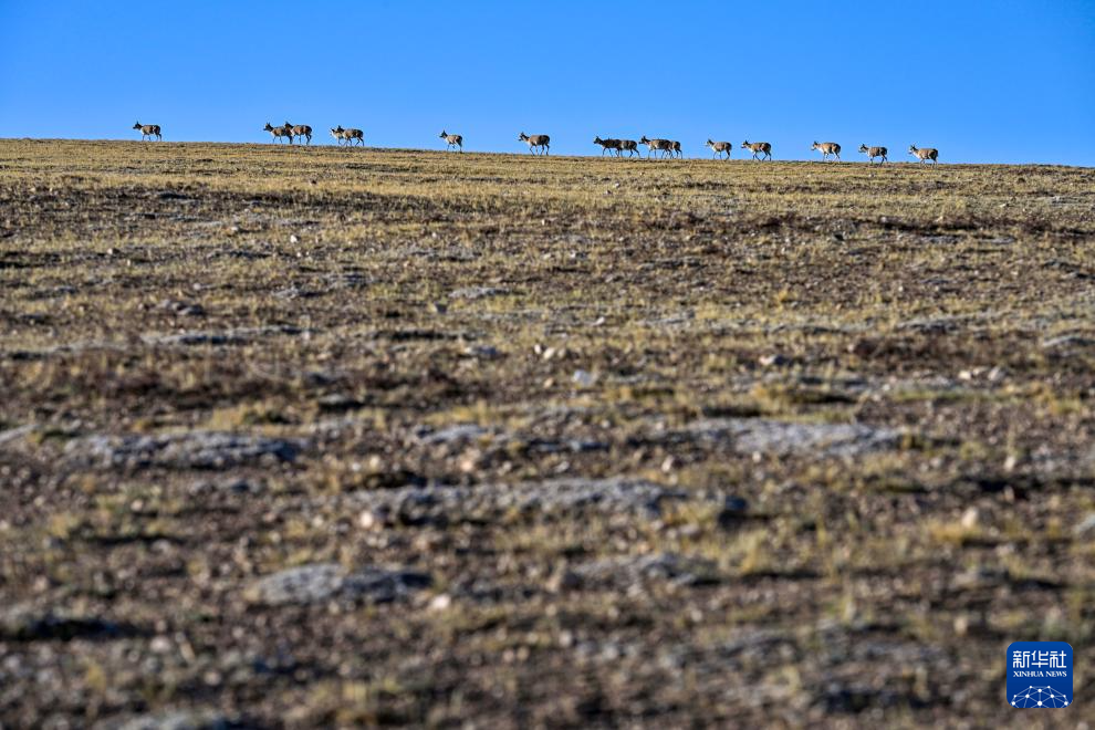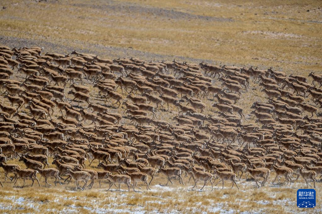 在羌塘國(guó)家級(jí)自然保護(hù)區(qū)核心區(qū)拍攝的遷徙中的雌性藏羚羊群(6月8日攝)。新華社記者 旦增尼瑪曲珠 攝 ??