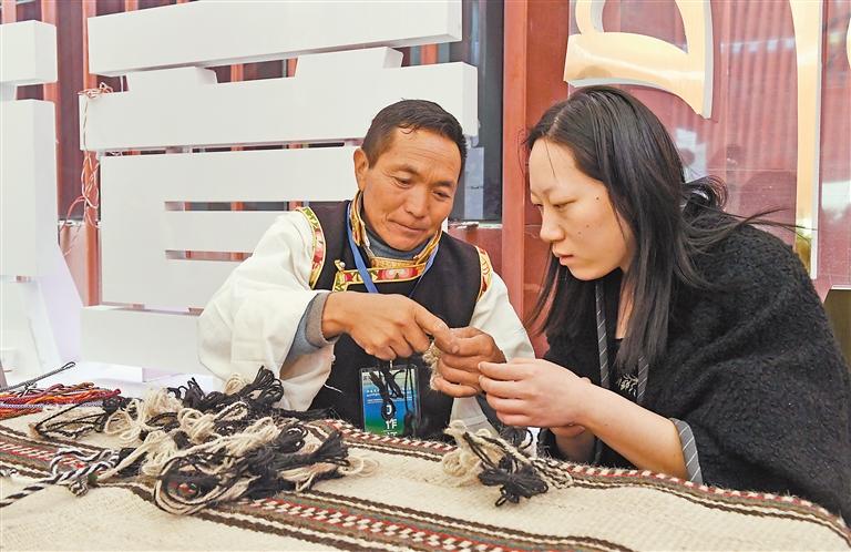 圖為游客(右)在體驗牦牛毛編織技藝。記者 旦增蘭澤 攝