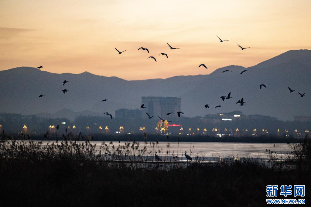 1月9日,傍晚時(shí)刻在拉薩市拉魯濕地越冬的黑頸鶴和候鳥(niǎo)。新華網(wǎng) 旦增努布 攝
