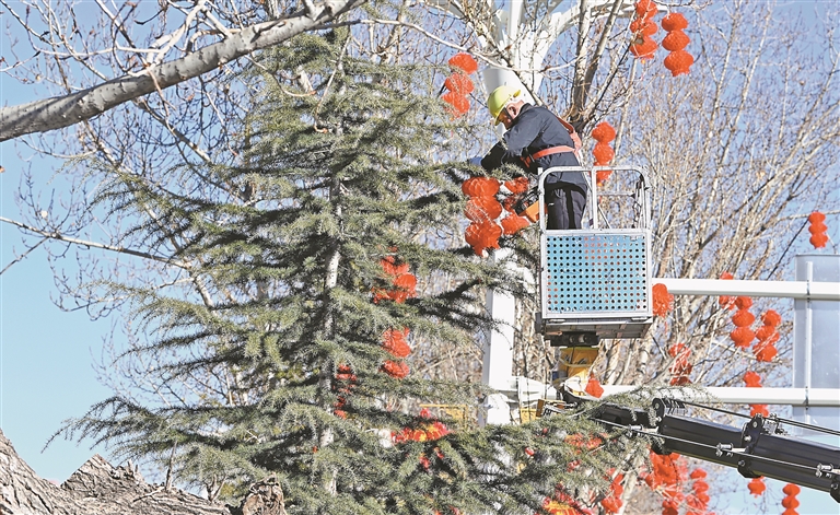 市政工人正在掛燈籠。記者 洛桑 唐斌 攝