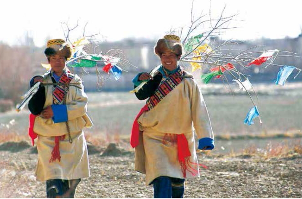 藏歷正月初三,又是一個(gè)激動(dòng)人心的日子,這一天清早起來,家家戶戶到屋頂“煨?!?。煨為漢語,是燃燒不見火焰的意思,“?!笔遣卣Z,是冒煙的意思,有人譯成“燒煙煙”、“燒神煙”,主要是煨燒香草和松枝柏葉升起裊裊香煙,驅(qū)除人間的污濁和瘟疫,祭祀鄉(xiāng)士神靈和護(hù)法神靈。接著,拔除屋頂去年插的經(jīng)幡,重新插上新的經(jīng)幡。經(jīng)幡是五種顏色的印滿經(jīng)文的布,固定在長長的柳樹枝上。據(jù)說紅色象征火焰,黃色象征土地,藍(lán)色象征天空,白色象征云彩,綠色象征江河。還有一種說法,五種顏色分別代表金、木、水、火、土五行。煨桑插旗后,人們一邊揚(yáng)撒糌粑,一邊高喊:“吉吉!索索!拉結(jié)羅!”(意思是供祭啊,供祭啊,神勝利了!)拉薩古城的房子都是平頂?shù)?,房舍屋宇緊緊相連。這一天成百上千的人,都站在屋頂上揚(yáng)撒糌粑,更換彩幡。糌粑粉如大雪紛飛,彩幡如鮮花怒放,祭神的呼聲此起彼伏,整個(gè)拉薩古城都成了神圣的祭壇,到處彌漫著熱烈的氣氛。