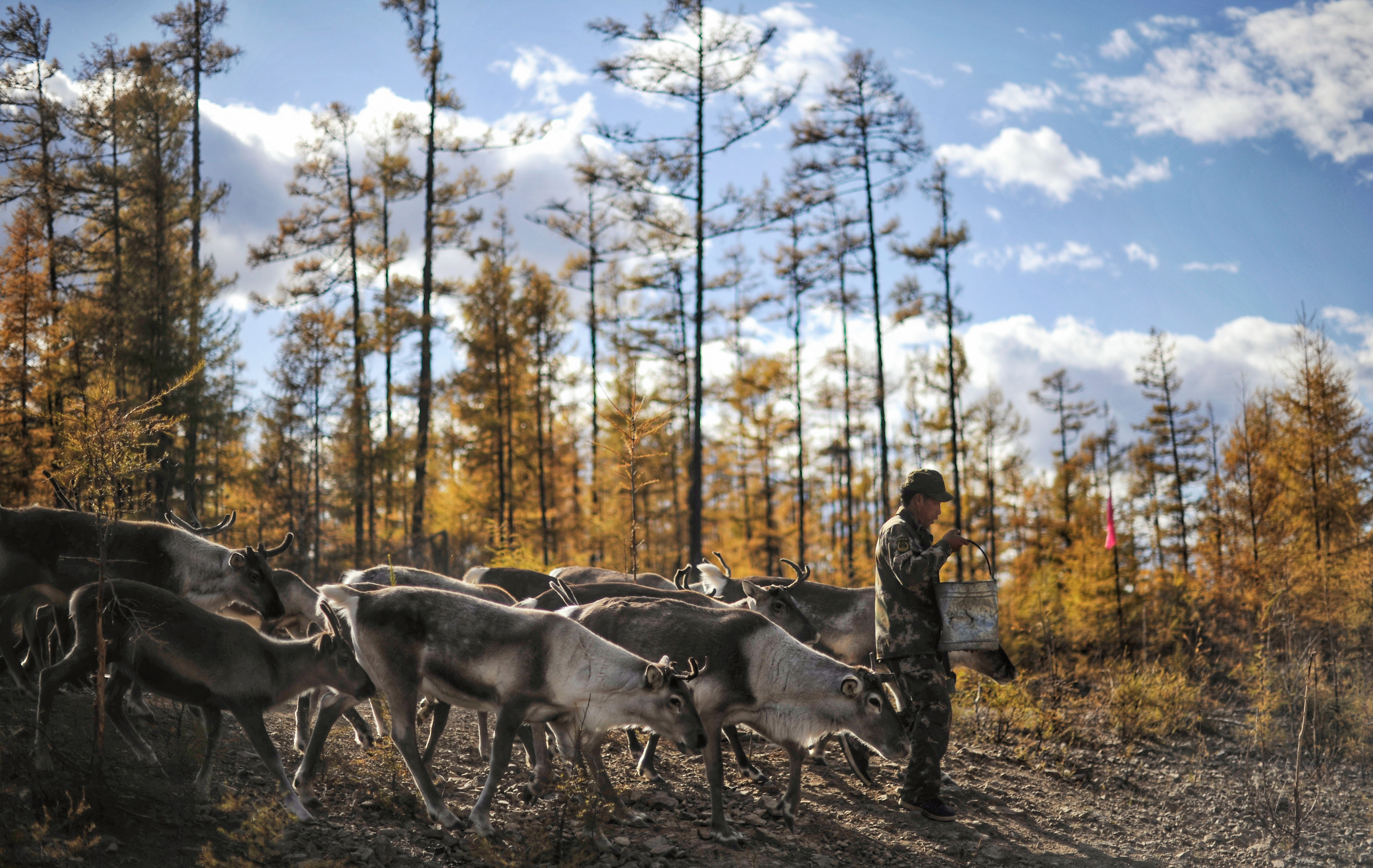 內(nèi)蒙古大興安嶺根河林業(yè)局約安里林場,林場職工張國華為馴鹿補充飼料。